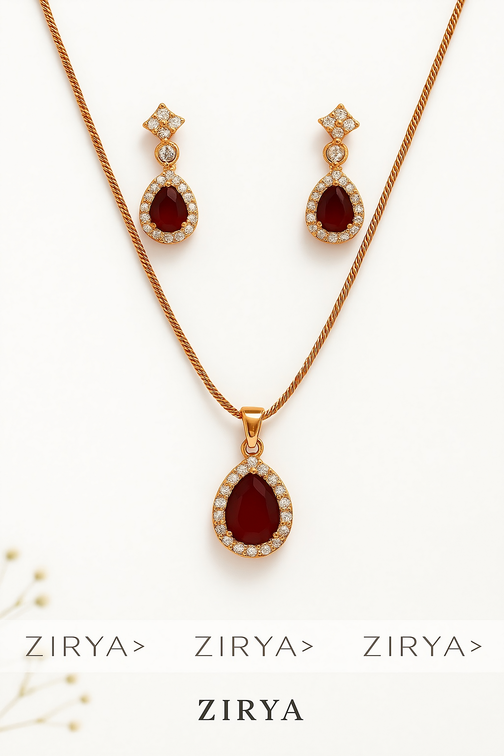 Indulge in classic, regal elegance with the Royal Aura Set. This matching ensemble—including a pendant necklace and dangle earrings—is designed to make a luxurious statement. Each piece features a dramatic, deep crimson simulated teardrop gem as its stunning centerpiece. This rich stone is flawlessly encircled by a brilliant halo of sparkling Cubic Zirconia (CZ), maximizing its size and light return.