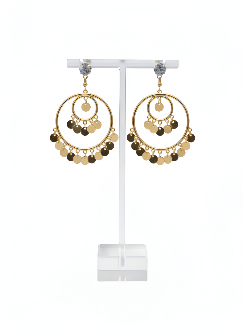 Bring the spirited energy of an exotic marketplace to your look with the ZIRYA Souk Shimmer Earrings. These captivating statement earrings embody bohemian luxury with their bold, globally-inspired design. The style starts with a clear, sparkling simulated stone post-back for a secure fit. Dangling below are cascading, nested gold-tone hoops, the largest of which is finished with a vibrant fringe of shimmering metallic discs. Designed to catch the light and create beautiful sound and movement, these lightweight earrings are the perfect accessory for festivals, vacation nights, or adding a dash of bold, worldly glamour to your everyday style.